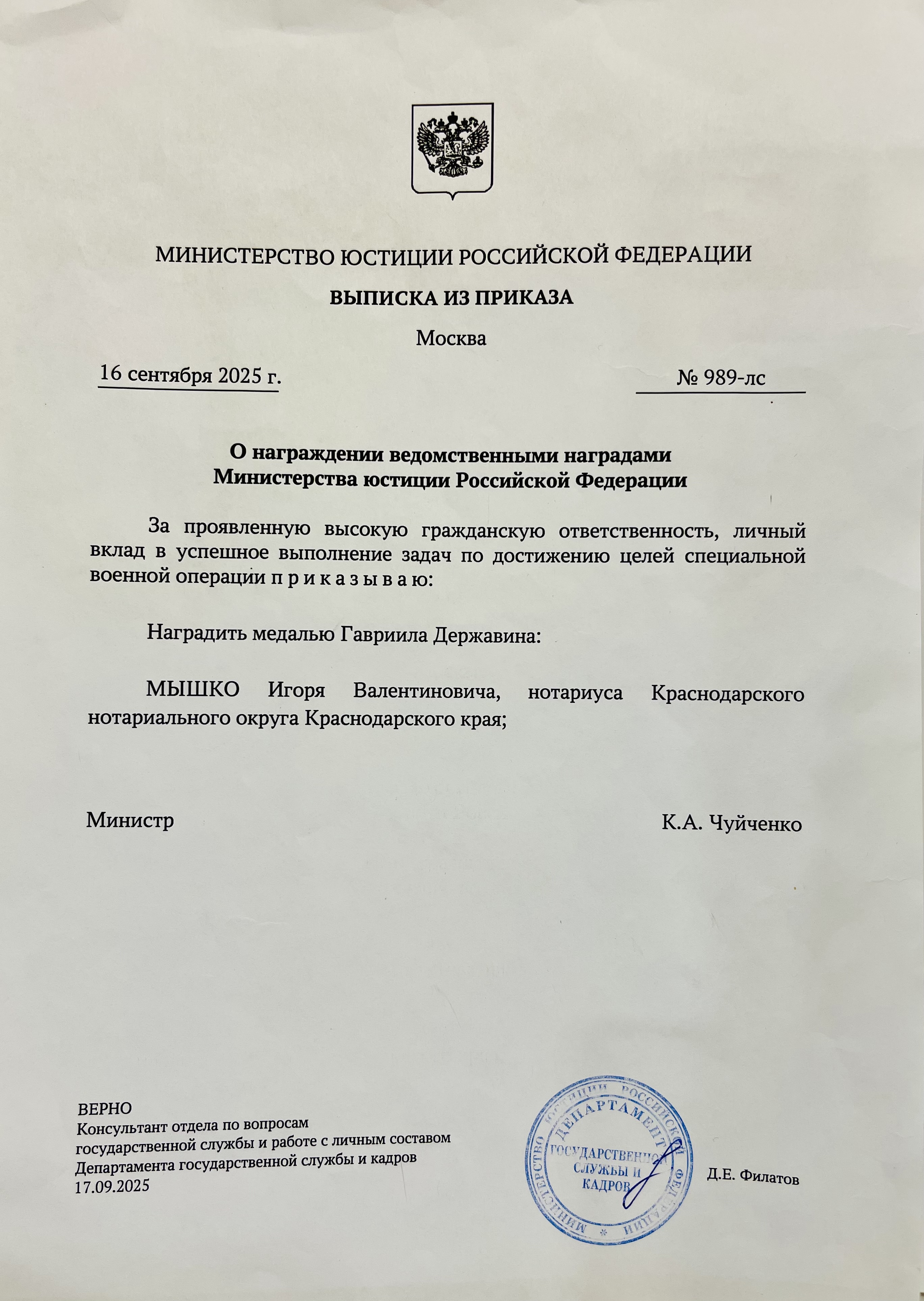 Основанием послужил приказ министра юстиции РФ Константина Чуйченко от 16 сентября 2025 года «О награждении ведомственными наградами Министерства юстиции Российской Федерации», в котором отмечены высокая гражданская ответственность и личный вклад награждаемого в успешное выполнение задач по достижению целей специальной военной операции.